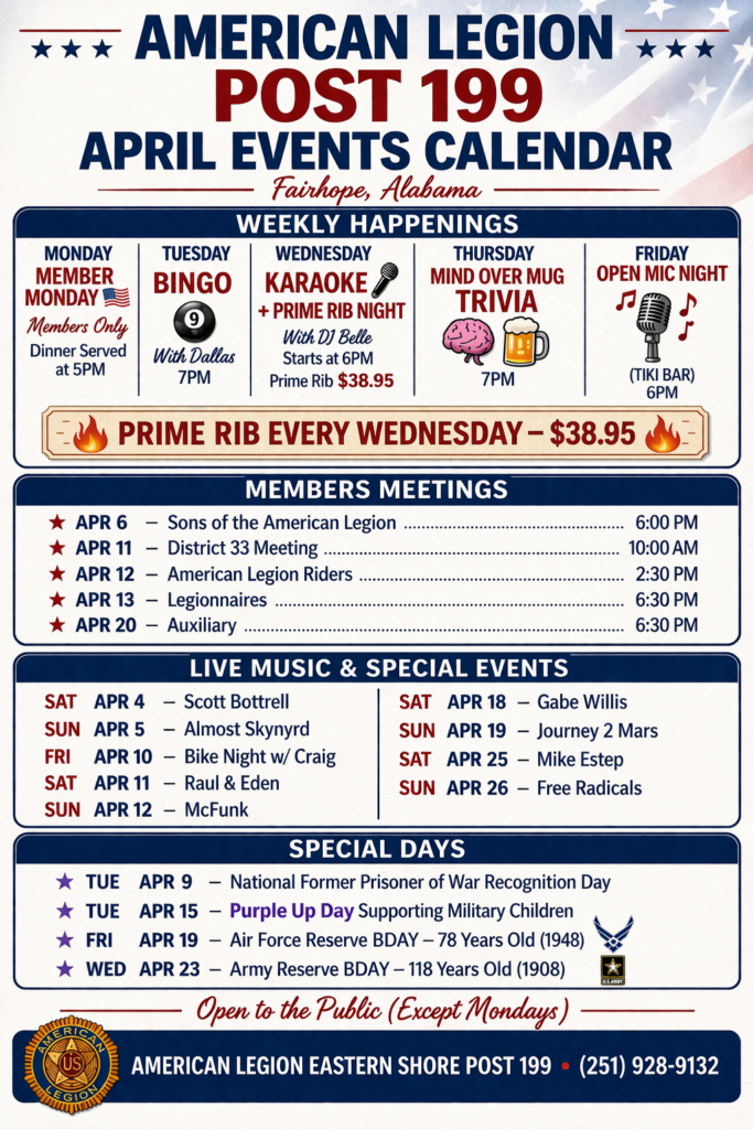 Visit us on the Mobile Bay to check out our activities, music offerings and facilities. Our Meeting Hall, Beach, Tiki Bar, and Beach Stage are available for Rentals!